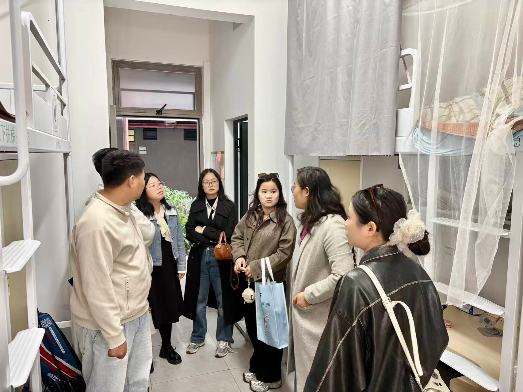 赵老师沿途详细介绍了学院在环境育人、学生行为习惯养成以及公寓精细化管理方面的具体做法。参观过程中,整洁有序的宿舍内务、富有专业特色的生活区文化布置以及科学规范的管理制度,都给我校老师留下了深刻印象,大家边走边看,边看边思,深受启发。