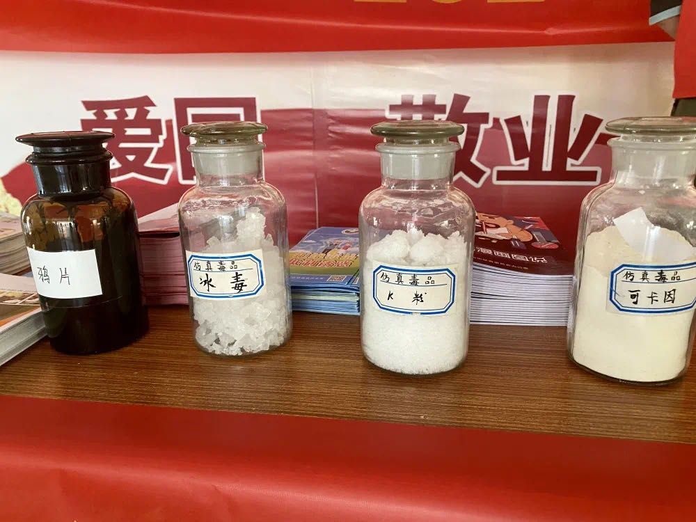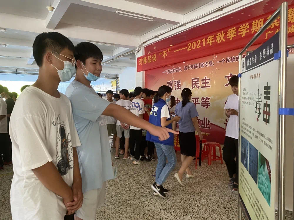 活动开展期间,通过在校内横挂禁毒宣传标语、展览禁毒教育文化内容和各式毒品的样品以及禁毒知识现场讲解进行禁毒宣传教育。