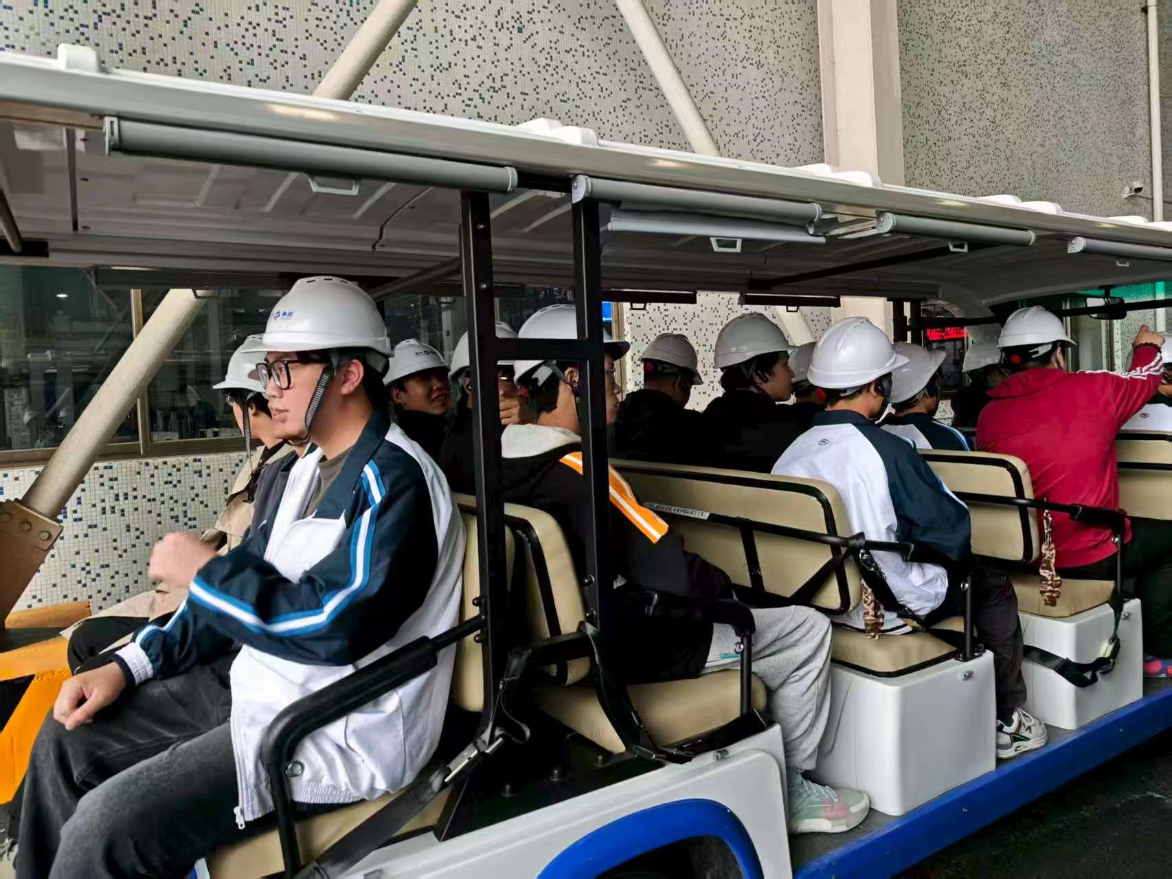 学生乘坐观光车参观学习