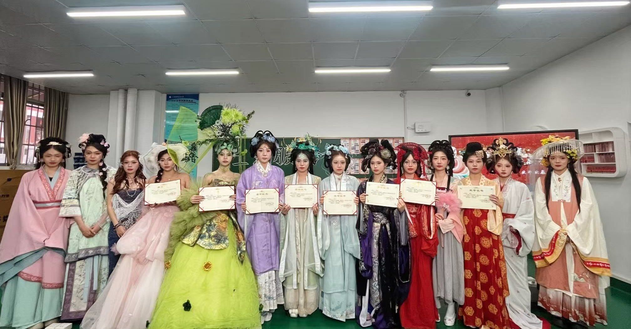 本次展示特邀广州金夫人婚纱艺术摄影有限公司化妆总监李洁霞、从化区高级化妆师邓其隆以及形象设计与健康管理专业教师陈清清、刘丹娜、黄彩怡等担任评委。评审从“妆容设计”“造型设计”“整体表现与创意”三大维度进行综合考评,注重技艺表现与文化内涵的统一。最终,评选出“最佳古风奖”四名、“最佳创意奖”三名、“优秀奖”三名,并为获奖学生颁发荣誉证书与奖品。