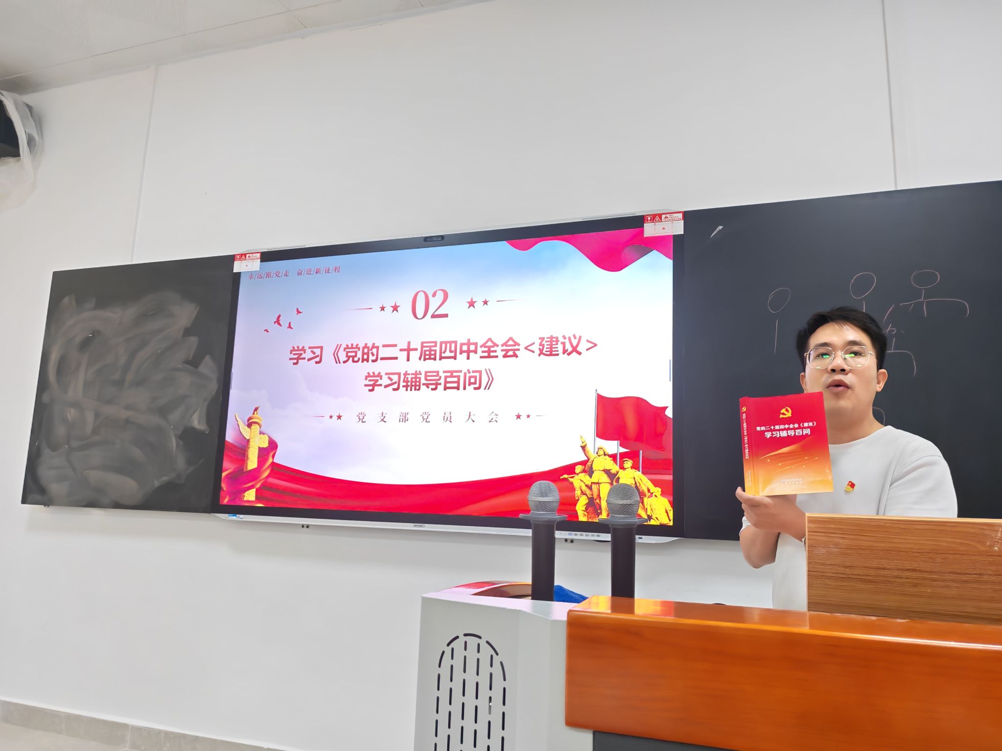 会议严格按照发展党员工作的相关规定和程序进行。第一项议程为支部书记领学,梁锦彬书记结合我校技工教育办学实际,带领全体党员学习了党的二十届四中全会公报(关键词)有关内容、学习《党的二十届四中全会<建议>学习辅导百问》部分内容。梁锦彬书记强调,思政与基础部作为学校思想政治教育的主阵地,全体党员要牢记为党育人、为国育才的初心使命,立足三尺讲台,将党建工作与教育教学工作深度融合,以高质量党建引领学校思政教育高质量发展。领学过程中,党员们认真聆听、仔细记录,纷纷表示要将学习成果转化为推动工作的实际行动。